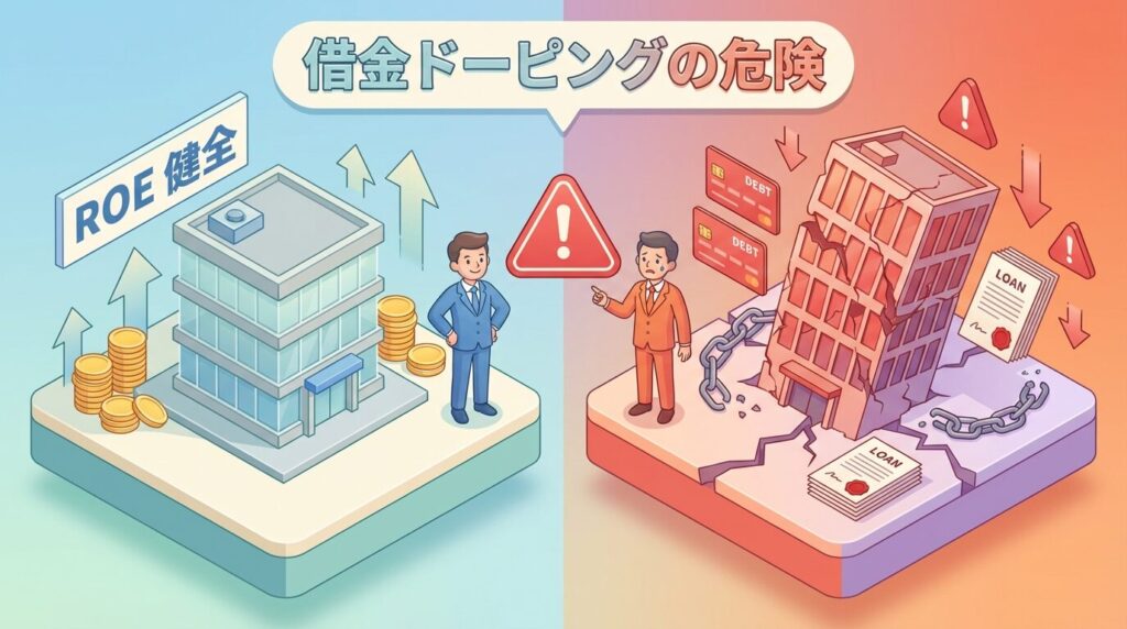 実は、ROEには 「借金をすればするほど高くなる」 という危険な性質があるのです。これを「財務レバレッジ」と呼びます。